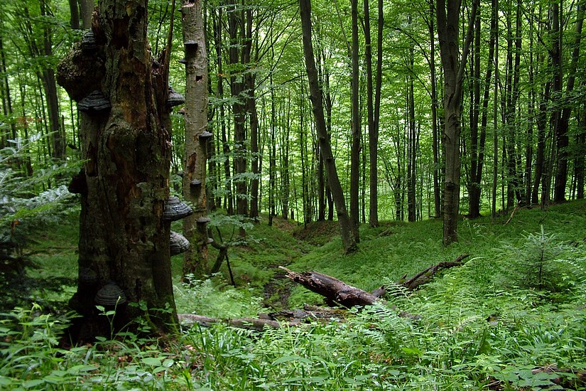Buczyna, a w niej gdzieniegdzie stare, wielkie buki.