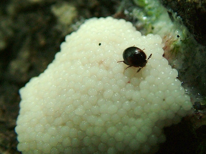 Przedstawiciel chrząszczy z rodziny grzybinek (Leiodidae) - żerujący na śluzowcu.