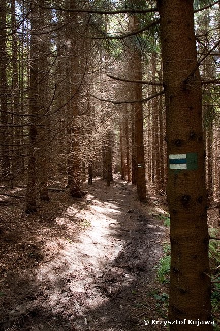 Odcinek niebieskiego szlaku z Pszczelin na Bukowe Berdo - las gospodarczy, kontrastujący ubogością z sąsiednimi lasami w BPN