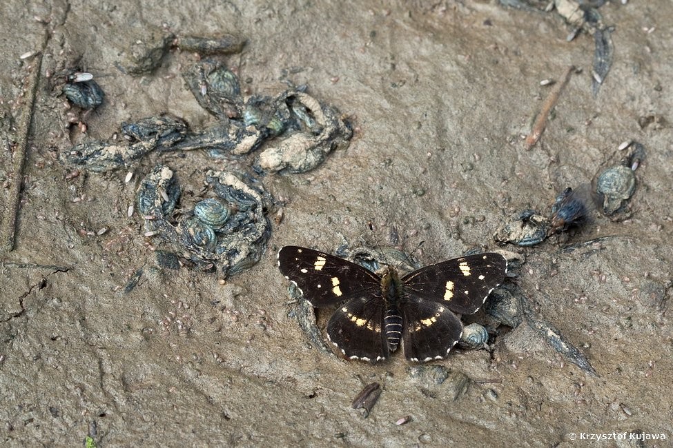Motyl żerujący na wysychającej kałuży z rozkładającymi się resztkami martwych kijanek.
