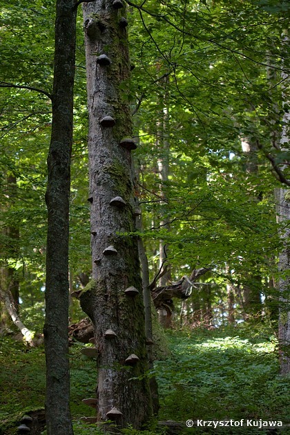 | Hubiaki pospolite (Fomes fomentarius) rozrastają się w martwym drewnie tworząc regularne kopytowate, wieloletnie owocniki. U pdstawy, nieco w tyłu "skromnie zasiadły" lakownice spłaszczone (Ganoderma applanatum) |