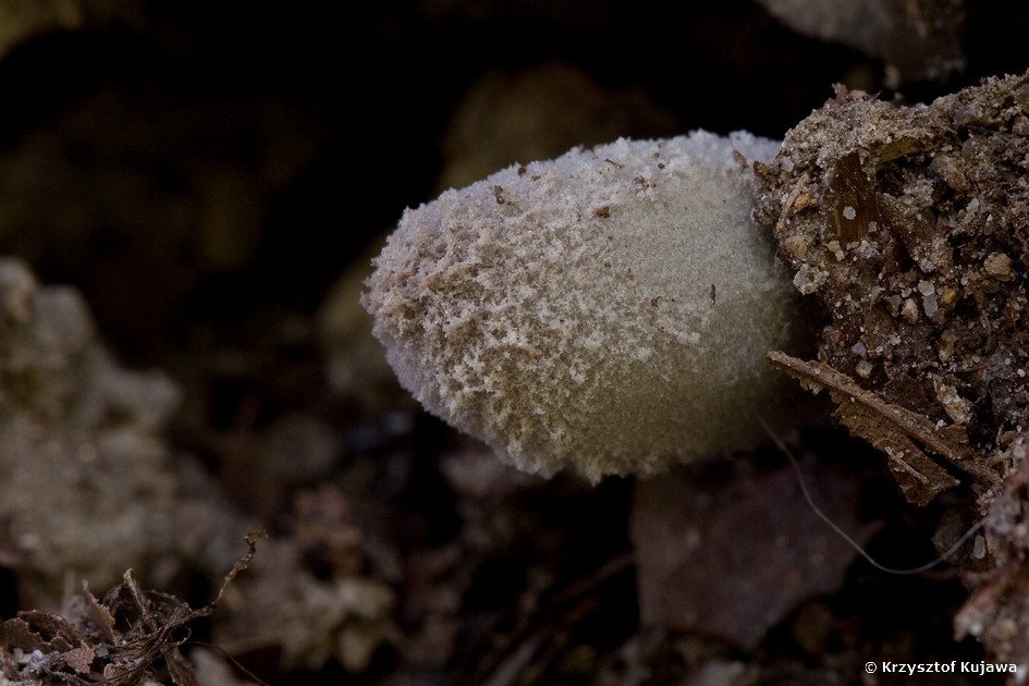 Ten niepozorny, skryty u podstawy kłody szarawy kapelusik (2 cm długości) okazał się rarytasem - bardzo rzadkim czernidłakiem omączonym (Coprinus laanii)