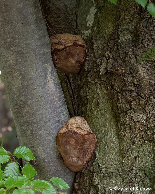 Na buku pomiędzy pień a rosnący blisko konar wciskały się czyrenie (Phellinus alni)