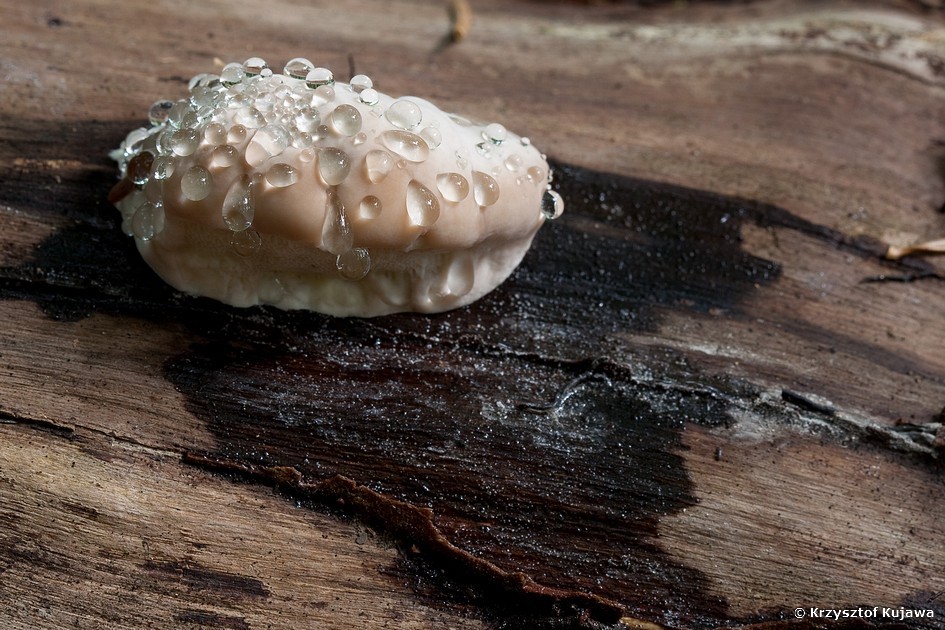 Odnotowujemy obecność wszędobylskiego pniarka obrzeżonego (Fomitopsis pinicola). Na tym owocniku pięknie widac zjawisko gutacji. Owocnik skapany we "łzach".