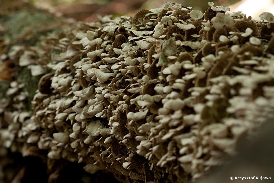 Gęstwina niszczyka liściastodrzewnego (Trichaptum biforme). Owocniki wyrastają gromadnie, jeden na drugim, w różnych kierunkach - istny bigos.