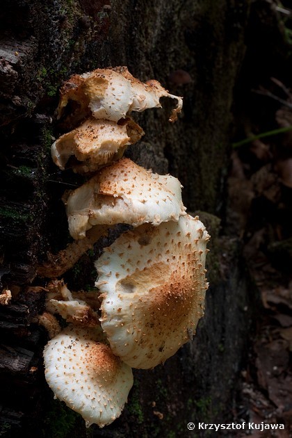 | Podobny do łuskwiaka nastroszonego, aromatyczny łuskwiak rdzawołuskowy (Pholiota squarrosoides) porastał często kłody. Spieraliśmy sie o to, czym pachnie. Jak skórka swieżo upieczonego chleba? Surowym ciastem drożdżowym? Owocami czy po prostu wydziela intensywny grzybowy zapach? Tak czy siak, pachniał pięknie. |