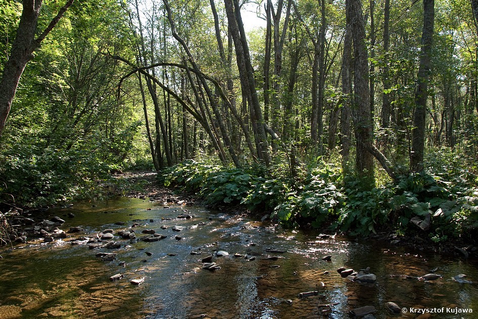 Wzdłuż rzeki rozwija się bujna nadrzeczna olszyna, a w niej ...