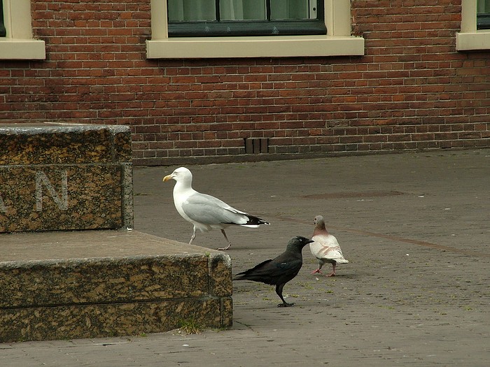 Mewa, kawka i gołąb - typowy zestaw ptaków widywanych na ulicach i placach Hagi