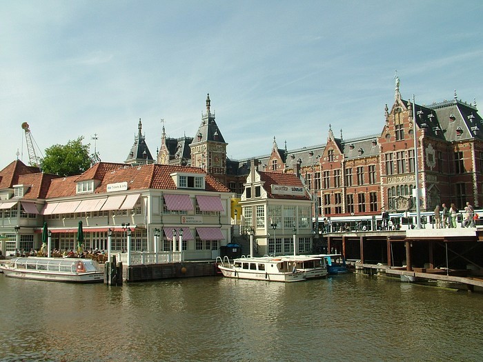 Widok na kolejowy dworzec centralny w Amsterdamie. W sąsiedztwie oczywiście kanały, kanaliki...