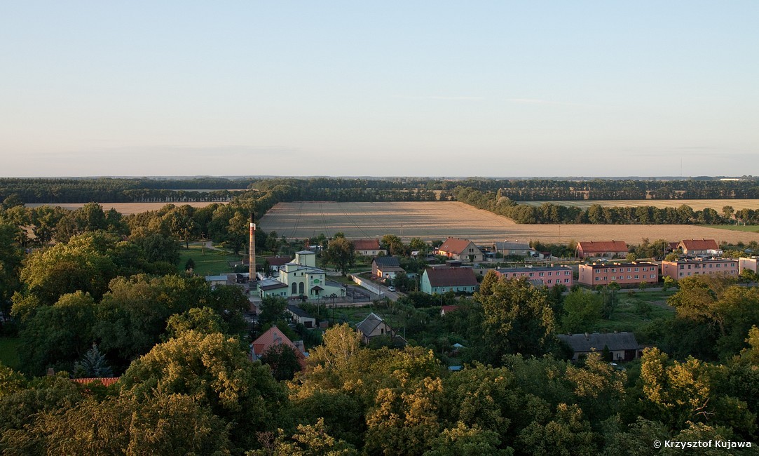 Widok na północ. Na pierwszym planie ul. Szkolna, a przy niej stara gorzelnia. Na drugim planie zadrzewienia pasowe założone przez gen. Chłapowskiego.
