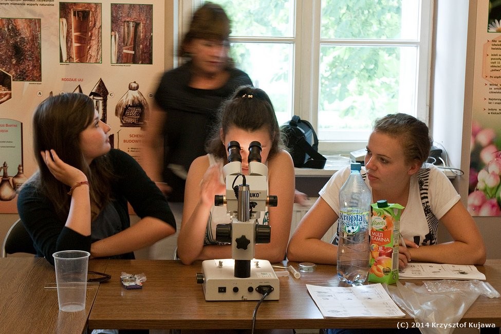 Grupa z Nietążkowa podczas zajęć laboratoryjnych z arachnologii, czyli oglądania i oznaczania pająków oraz ich ofiar, zebranych podczas zajęć w terenie.