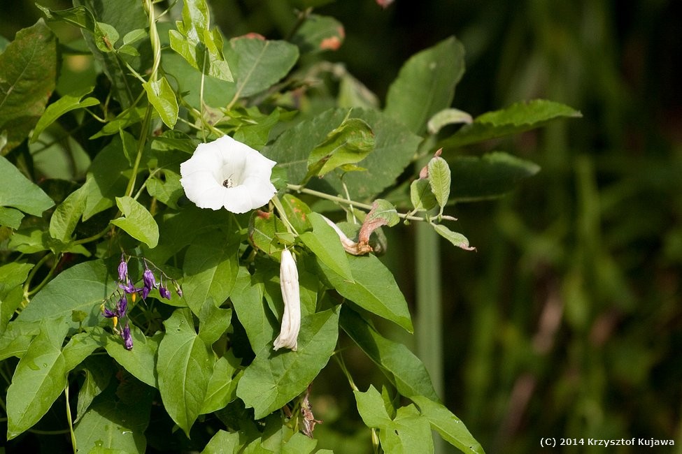 Przydroże - kielisznik zaroślowy (ten biały) oraz psianka słodkogórz (fioletowo- żółta), bliska krewniaczka ziemniaka.