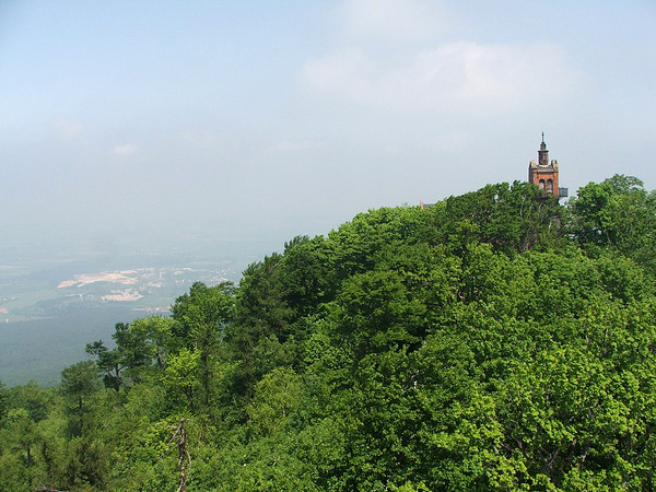 Fragment szczytu Ślęży, wspomniany już kościół i widok na Równinę Wrocławską. Szkoda, że powietrze było tak mało przejrzyste.