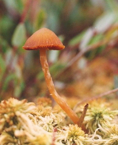 Hełmówka (Galerina sp.). To grzyb typowy dla torfowisk, owocnik na zdjęciu wyrasta właśnie spośród torfowców.