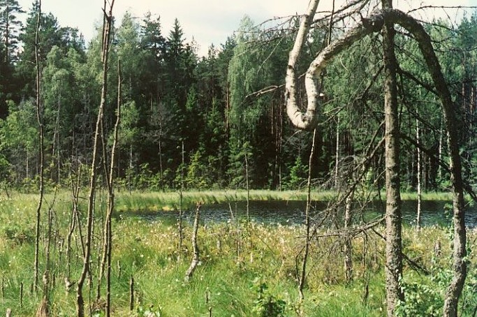 Śródleśne jeziorko z torfowiskiem wysokim - siedliskiem wielu rzadkich w Polsce i chronionych gatunków, jak np. rosiczki