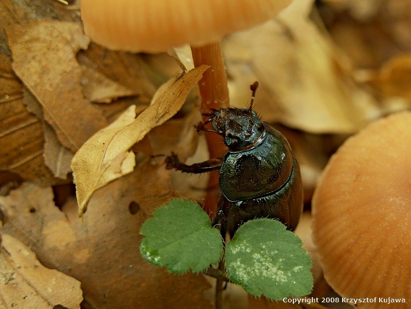Żuk (Geotrupes sp.) na lakówce pospolitej (Laccaria laccata)